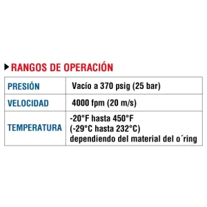 TEMPERATURA: -20°F hasta 450°F (-29°C hasta 232°C) dependiendo del material del o´ring