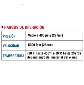 TEMPERATURA: -20°F hasta 450°F (-29°C hasta 232°C) dependiendo del material del o`ring
